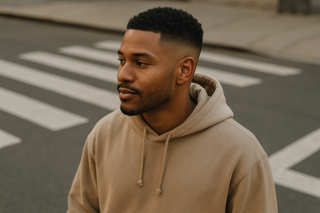 The Temple Fade with Curly Top combines the clean, tapered lines of a temple fade with the voluminous texture of curly hair on top. This style maintains a short length on the sides that accentuates sharp angles, while allowing the curls on top to add height and texture. It’s ideal for those with naturally curly hair seeking an edgy yet polished look. Suitable for various face shapes, especially oblong and oval, as the voluminous top creates balance. Compared to similar hairstyles, this cut uniquely highlights the curls while ensuring a sleek, well-defined fade. Popular in contemporary fashion circles, it merges modern trends with a nod to classic styles.