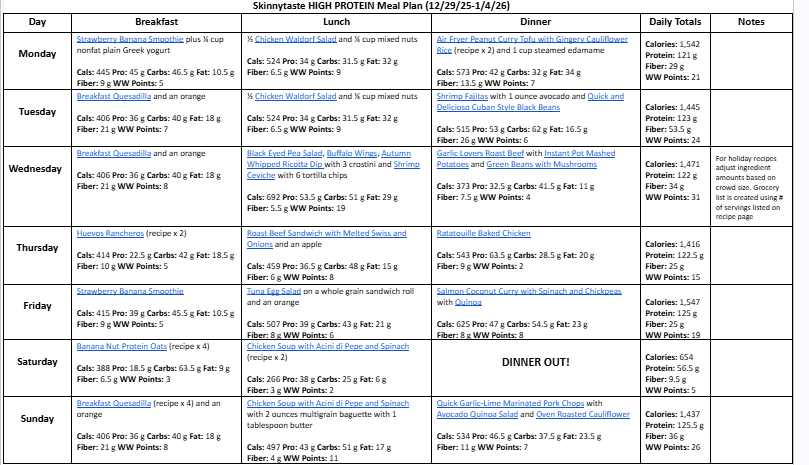 Breakfast and lunch Monday-Friday, are designed to serve 1 while dinners and all meals on Saturday and Sunday are designed to serve a family of 4. Some recipes make enough leftovers for two nights or lunch the next day. The grocery list is comprehensive and includes everything you need to make all meals on the plan. Add some high protein snacks to help you reach your protein goals.