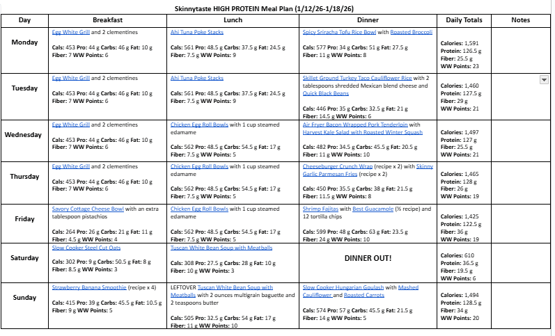 A free, 7-day high protein, high fiber diet meal plan including breakfast, lunch and dinner ideas and a shopping list. All recipes include macros and Weight Watchers points.