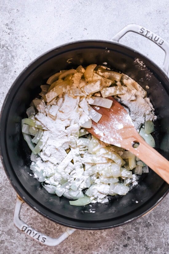 - Sauté the onions in butter until soft. Then stir in the flour and cook for 2 minutes.