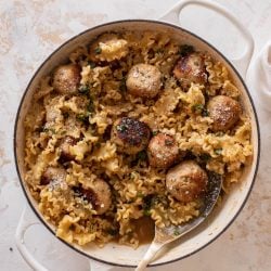 Transfer the meatballs back to the pan, nestling them in with the noodles and stock. Bring the mixture to a boil. Reduce it to a simmer and cover. Cook for 10 to 15 minutes, depending on which noodles you use, until the liquid is absorbed. It doesn’t all need to be absorbed, as it will absorb over time as the noodles sit. But you want the noodles fully cooked!