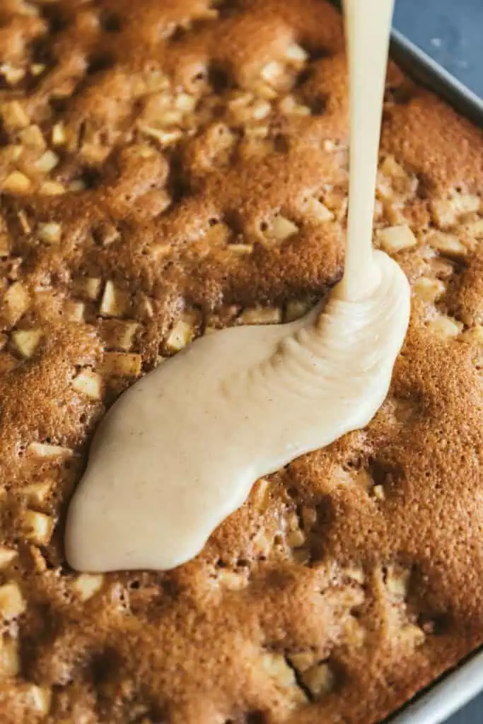- Make the Warm Glaze. While the cake bakes, melt the butter and apple cider together in a medium saucepan over medium heat. Whisk in the powdered sugar, sour cream, and cinnamon until smooth and pourable.