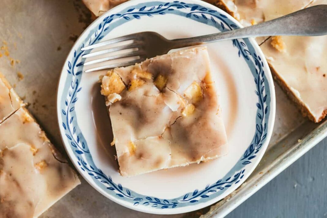 - Toss and Top the Apples. In a small bowl, toss together the diced apples, granulated sugar, cornstarch, and cinnamon until the apples are well coated. Scatter the apples evenly over the batter, then gently press and swirl them in with an offset spatula so they’re nestled just under the surface.