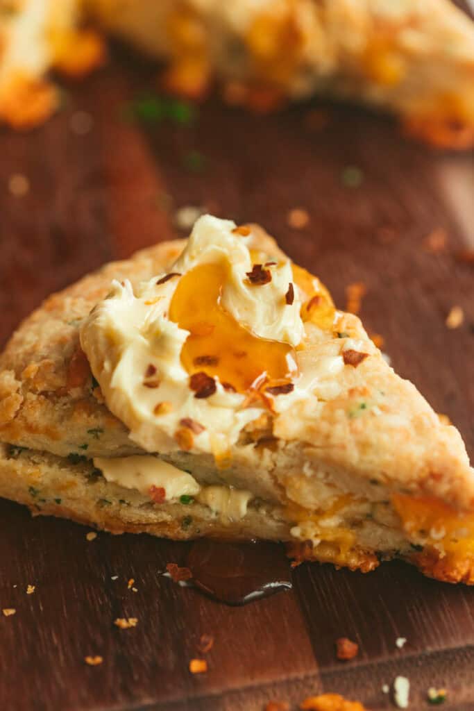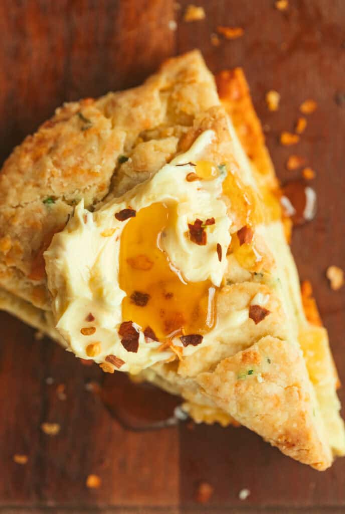 These cheddar chive scones are big, flaky, and full of sharp cheddar and fresh chives, finished with whipped hot honey butter for a savory-sweet brunch favorite.