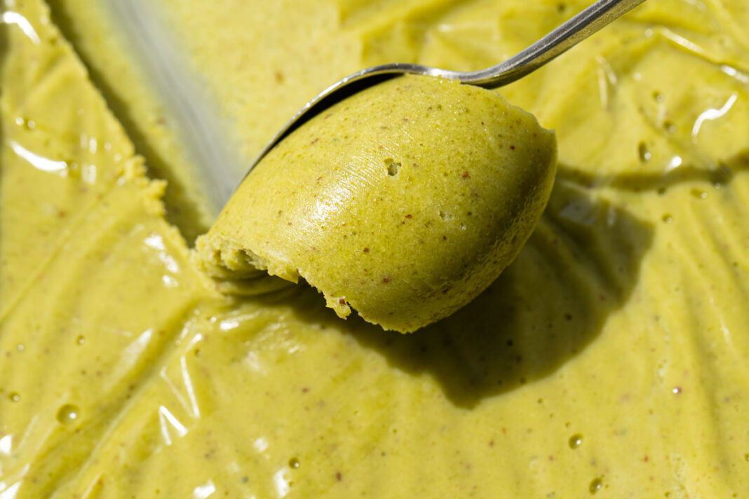 Add pistachio butter, and mix again until very smooth and a uniform green color throughout.