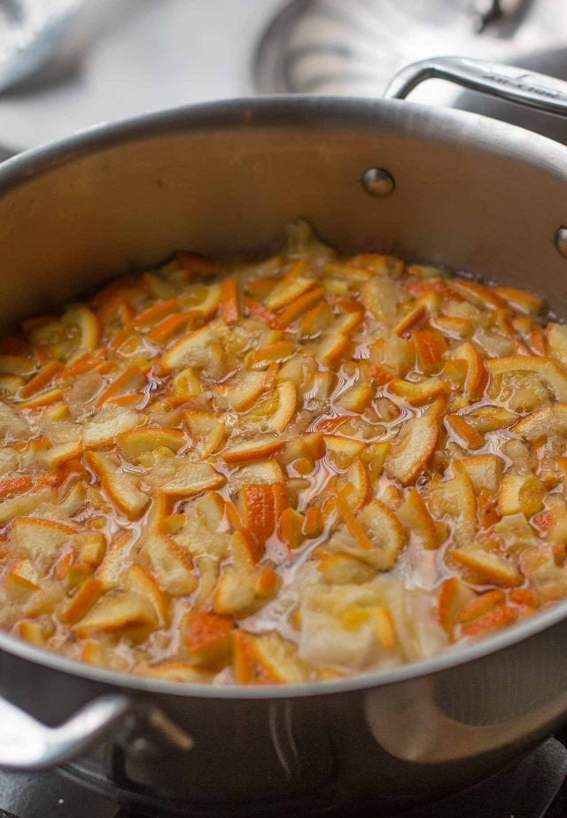 Cut each rind into 3 pieces and use a sharp chef’s knife to cut the rinds into slices or cubes as thin as possible. Each piece shouldn’t be too large (no more than a centimeter, or 1/3-inch in length.) Cut the navel orange into similar-sized pieces.