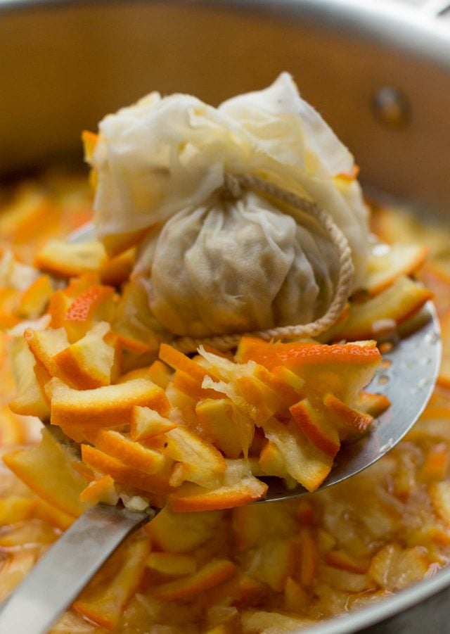 They’re wrapped in a sack and cooked with the marmalade giving the marmalade gets a suave, jellied texture. And this simple method, featured in my book Ready for Dessert, makes the whole process much easier.