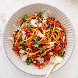 This winter burst tomato sauce is the perfect way to get fresh tasting tomato sauce in the dead of winter! Cherry tomatoes burst with tons of garlic to make a delicious sauce that coats the tender pasta like a dream. It’s so delicious!