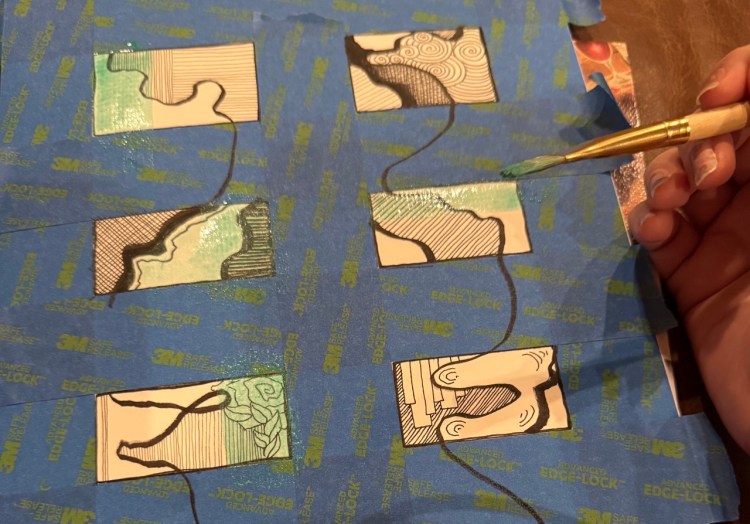 I put down painter’s tape on watercolor paper and then outlined the boxes and drew my own wild map borders.
